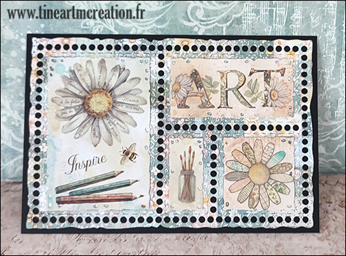 Les trois créations suivantes ont été faites avec des décalcomanies (transfer film ou rub-on), un grand choix est disponible dans cette collection, le fond rectangle perforé est réalisé avec des dies de la marque AALL&CREATE réf. #57 :
