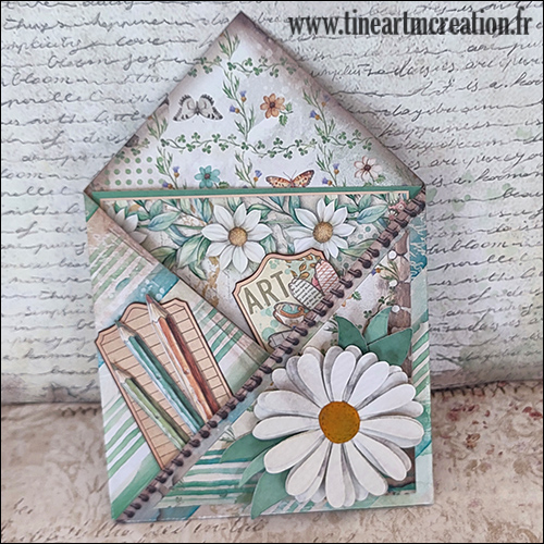 Ensuite une enveloppe réalisée également à la main avec une carte à l’intérieur, la marguerite collée est faite avec des dies « Leane Creatief« , réf Multi flower 009 :