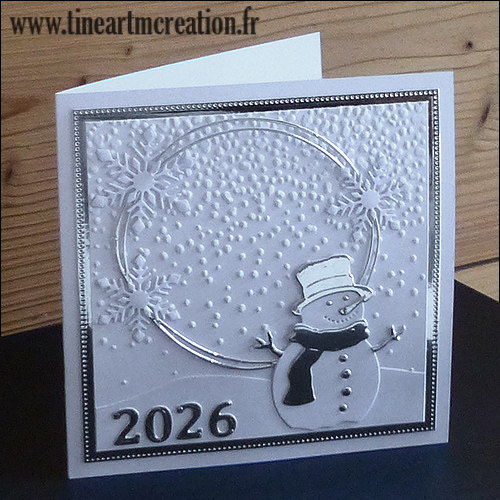 Le voici donc qui prend place en premier sur une carte de vœux, un classeur de gaufrage « Sizzix » a servi pour faire le relief de la neige :